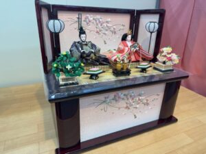 後ろのお飾りは、ワイン塗りの台屏風にリボン桜の刺繍が施されて、優しく上品な「ことのは」収納飾りです🌸