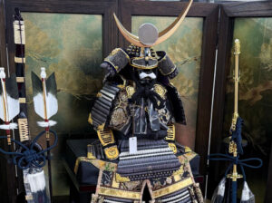 グレーの段威でシックなイメージの鎧の色合いが古代箔屏風の雰囲気にぴったりで、ご長男様への鎧飾りとしてお選びいただきました❣️