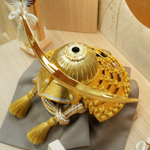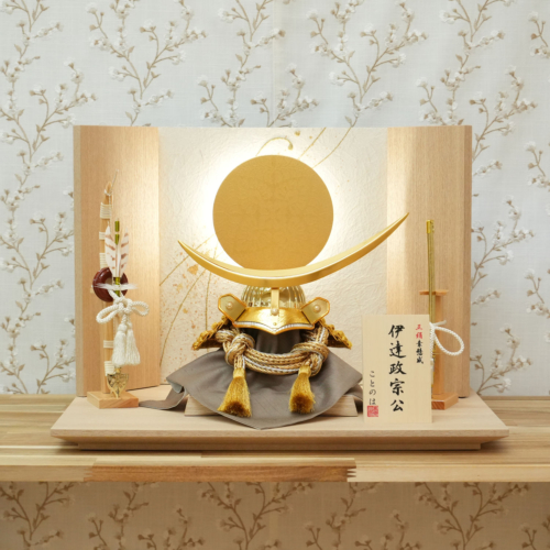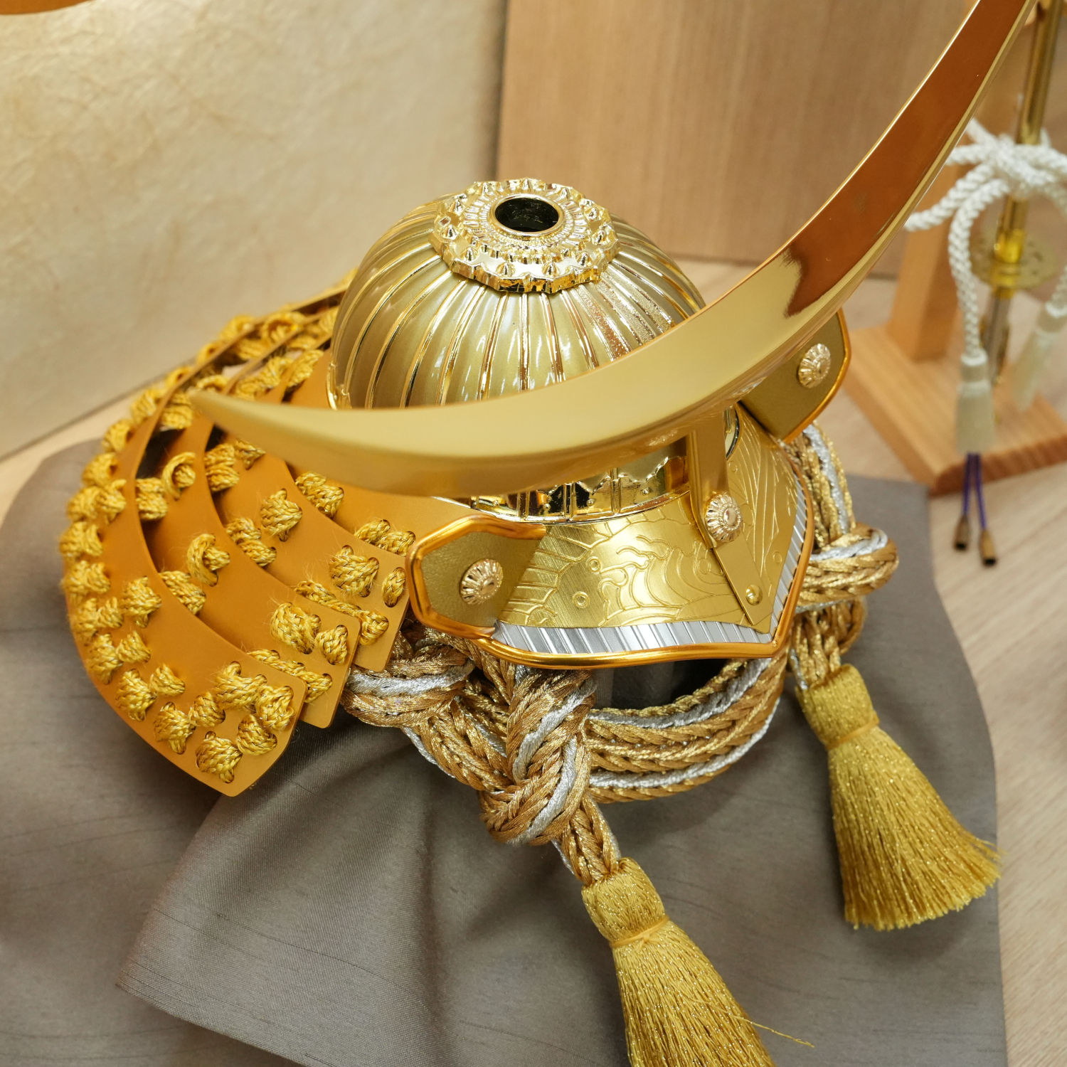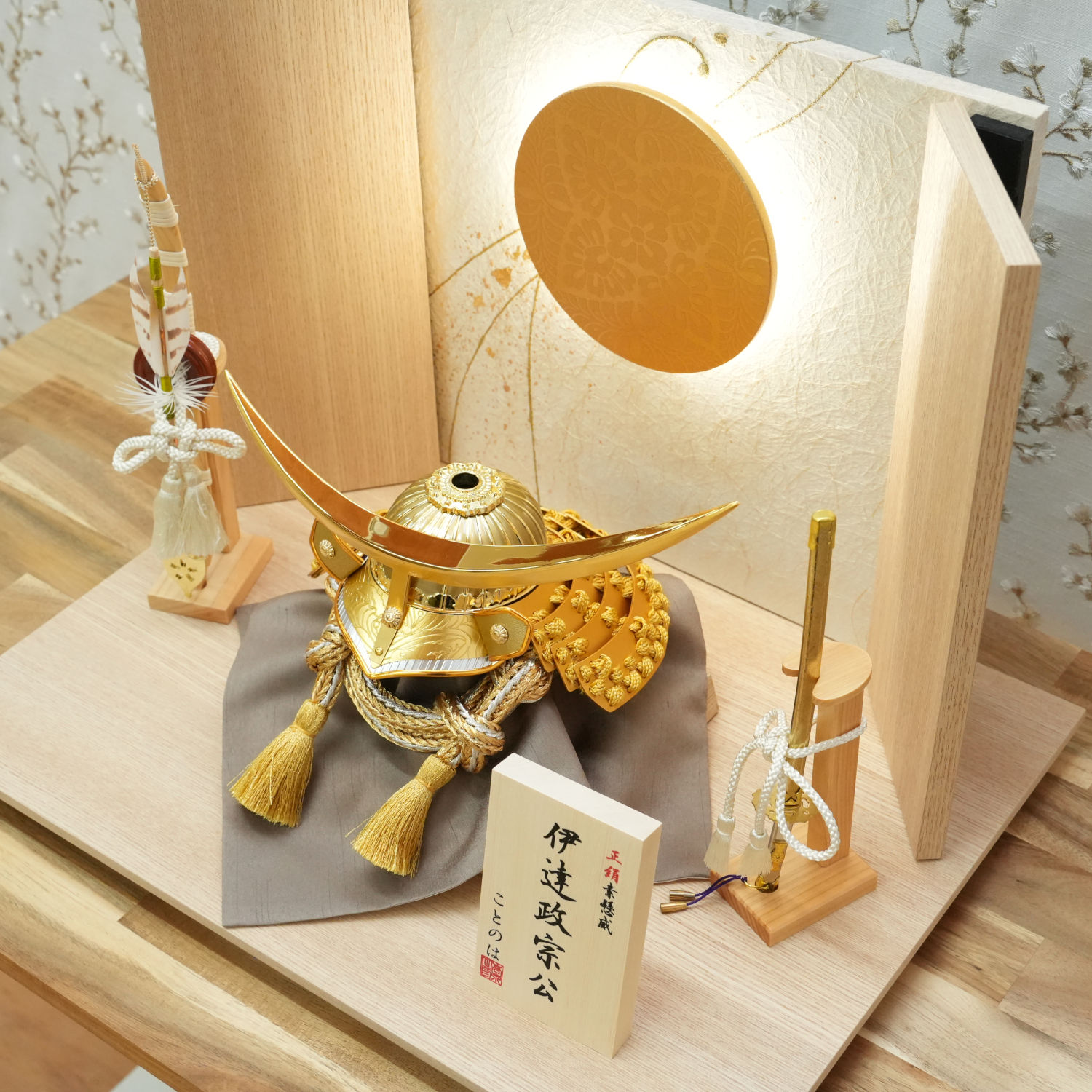 金色の伊達政宗公の兜が、モダンな雰囲気で空間に馴染み、リビングにも自然に溶け込む上品な兜飾りです。