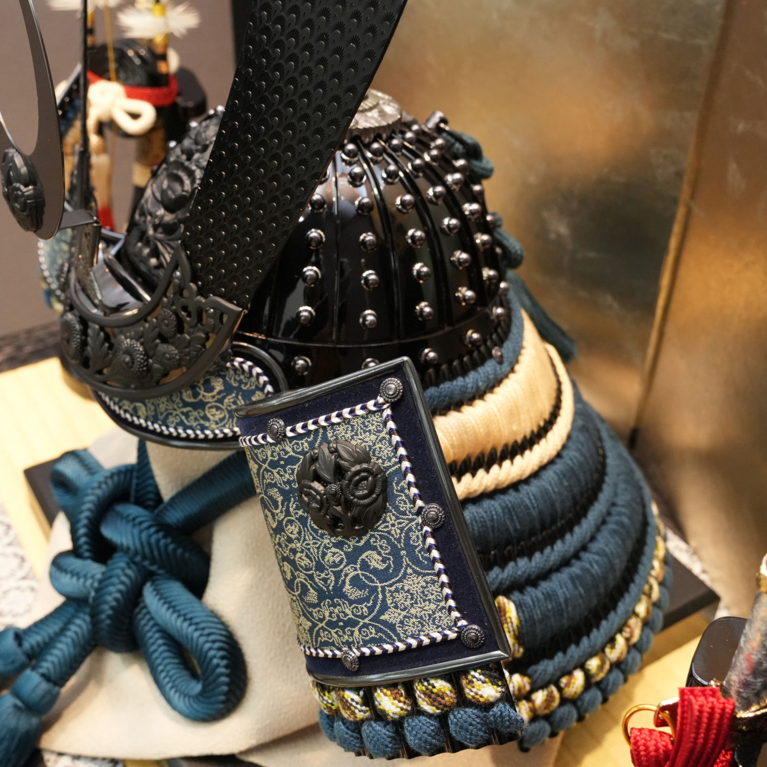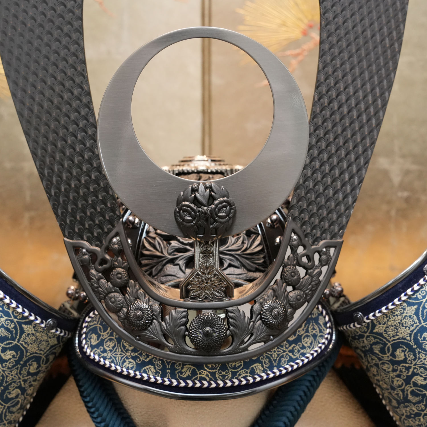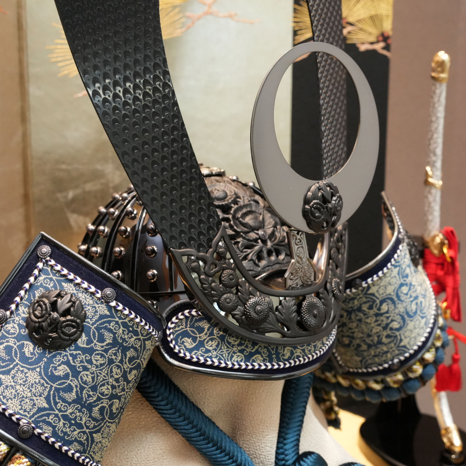 静寂に包まれた黒色の兜に、吹返しの龍村美術織物が堂々たる輝きを放ちます。