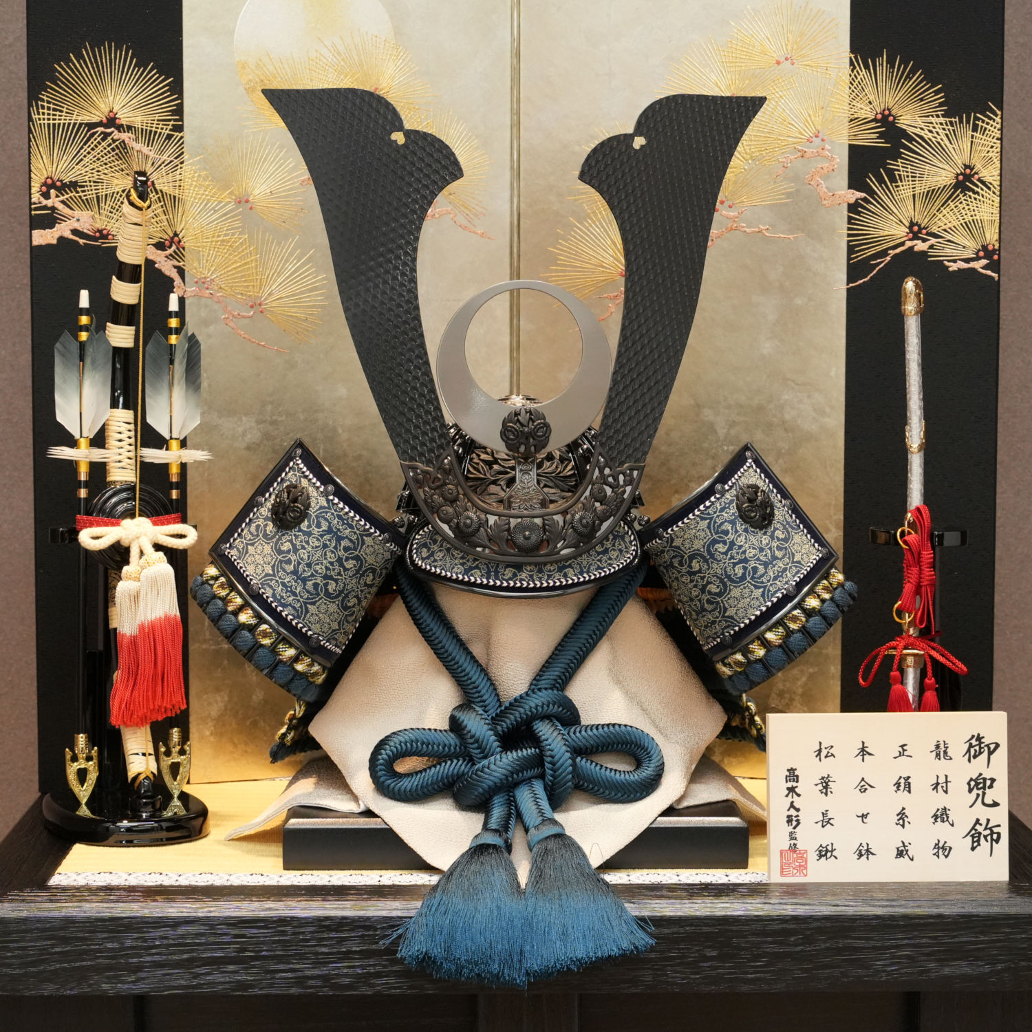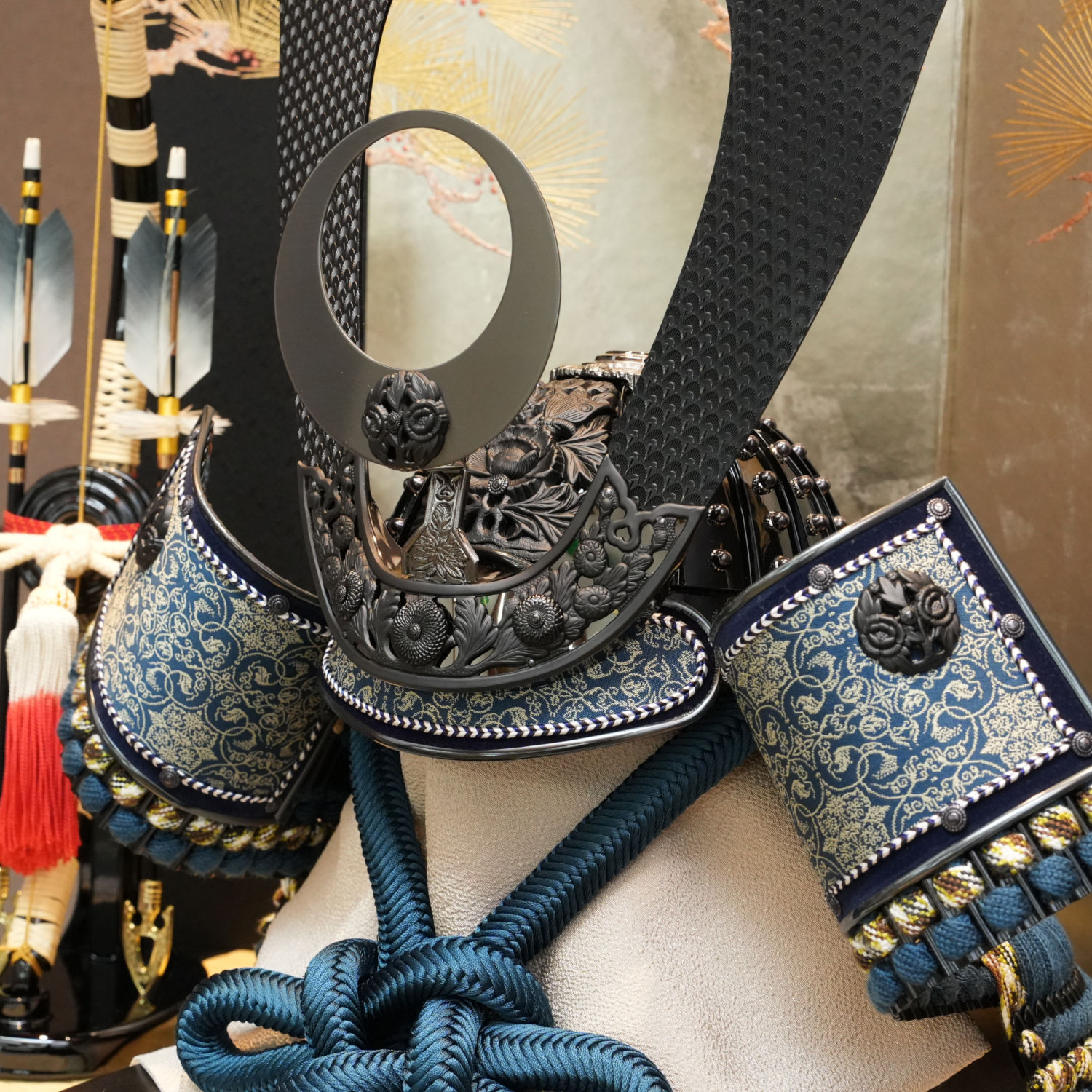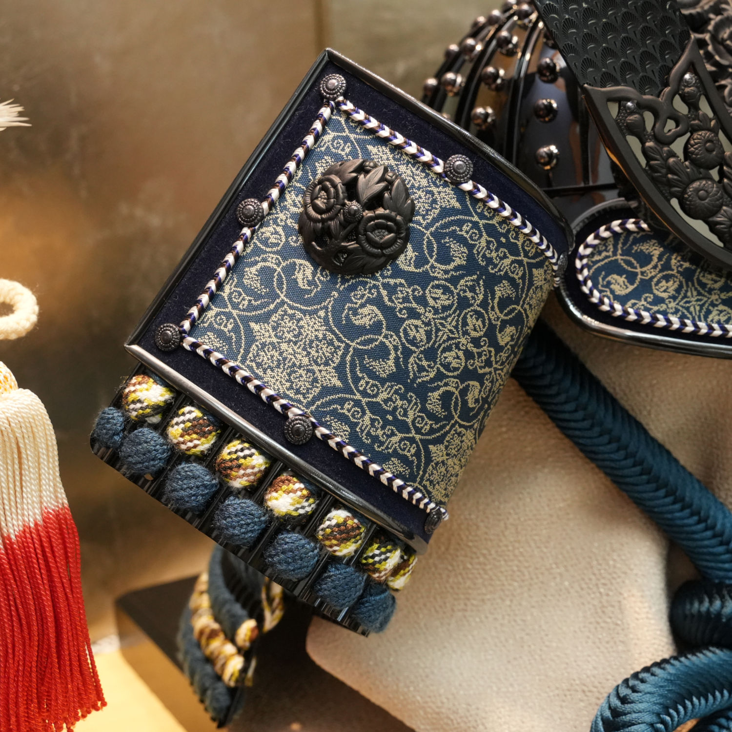 静寂に包まれた黒色の兜に、吹返しの龍村美術織物が堂々たる輝きを放ちます。