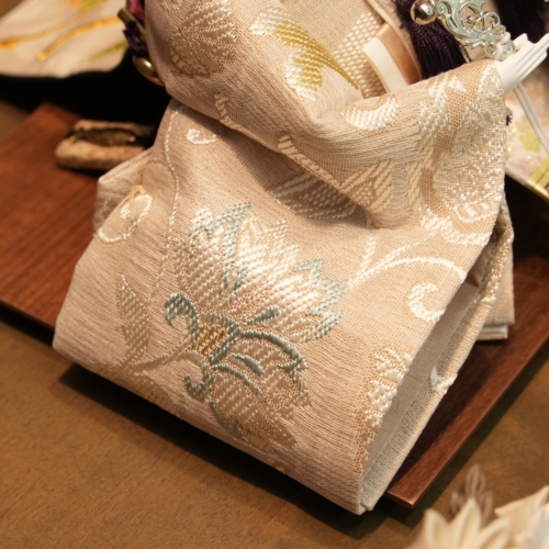 重なり合う色糸が生み出す奥行きと、わずかな光の角度で表情を変える色合いが、お人形の装いに豊かな深みと雅な華やかさを添えます。