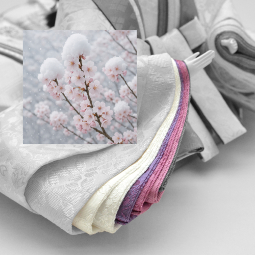 淡く染められた色合いに桜の地模様が優しく映り、正絹の放つ特有の光沢に奥行と風合いを与え魅了します。