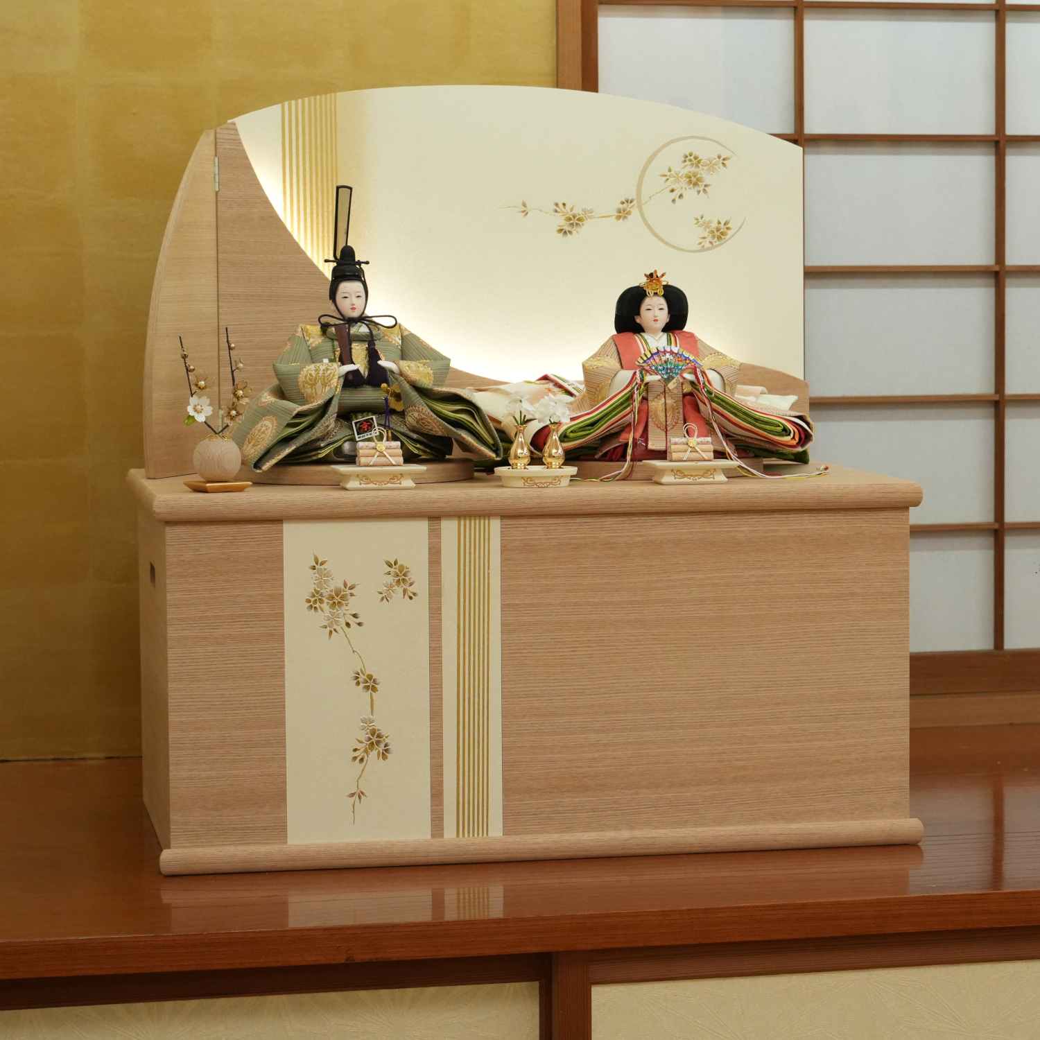 木目の柔らかな雰囲気を活かし、屏風に嵌め込まれた間接照明が和の趣を感じさせるお雛様です。