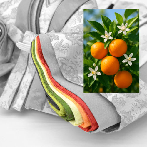 花と葉と実が同時に息づく、その稀な瞬間をかさねに映した「花橘」のかさね色です。